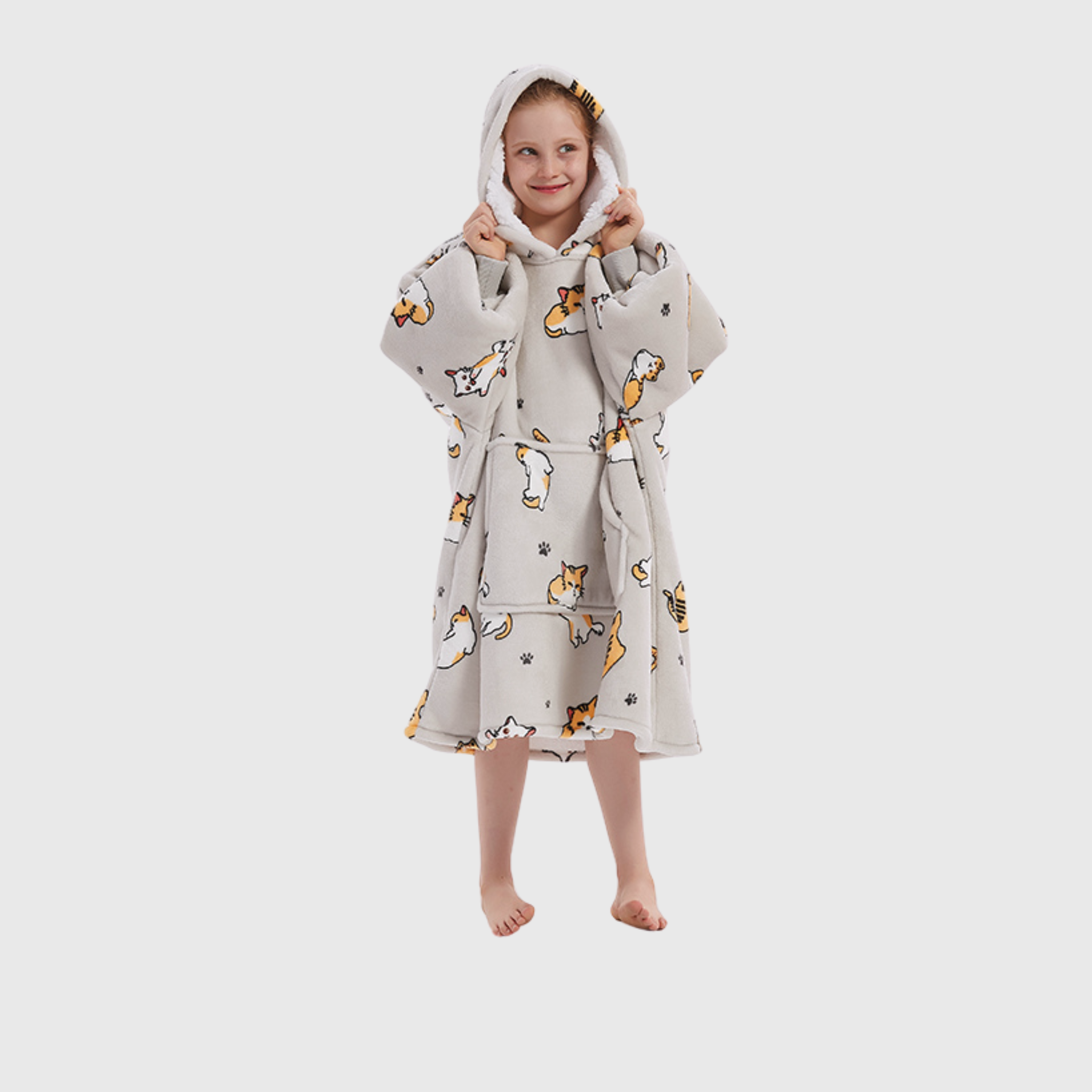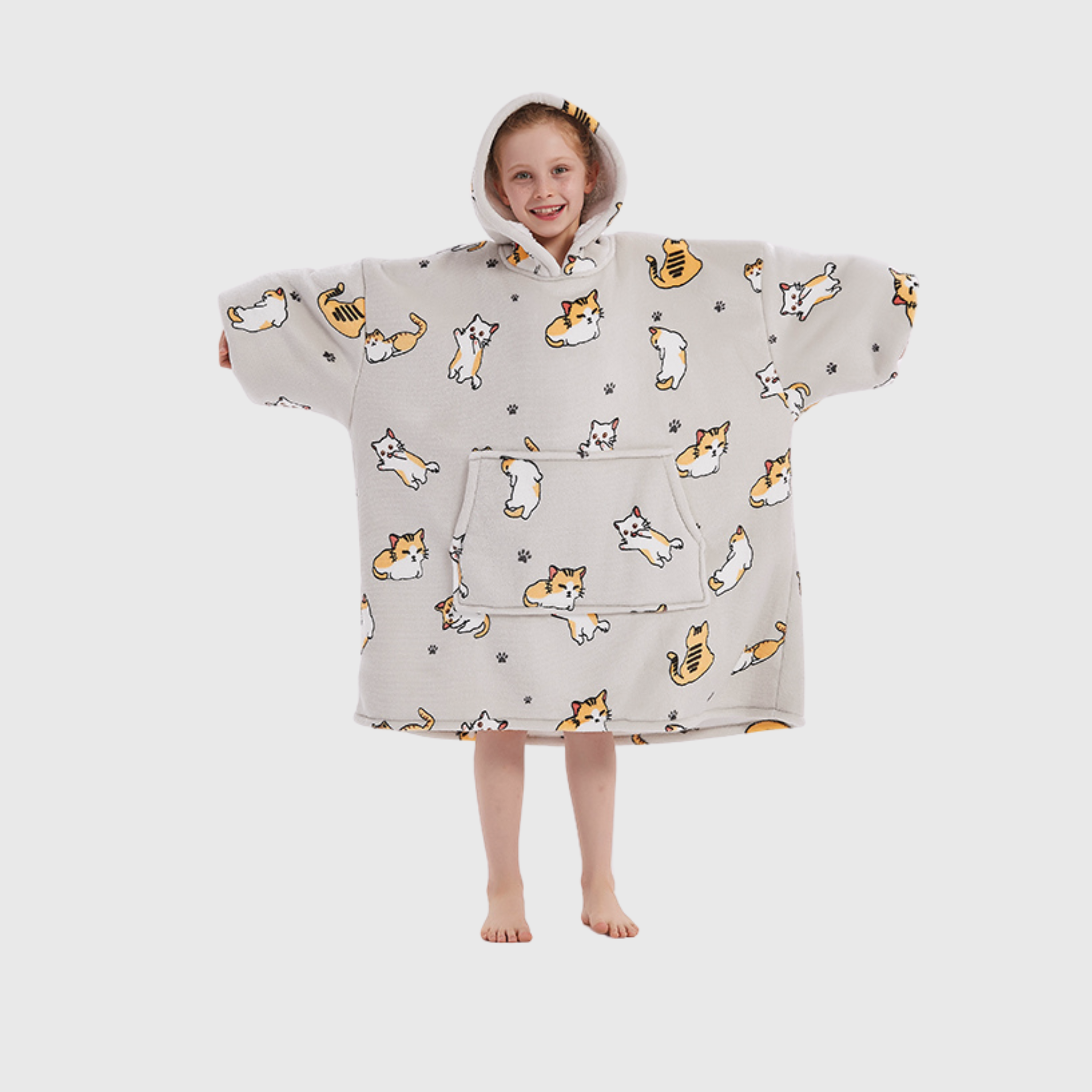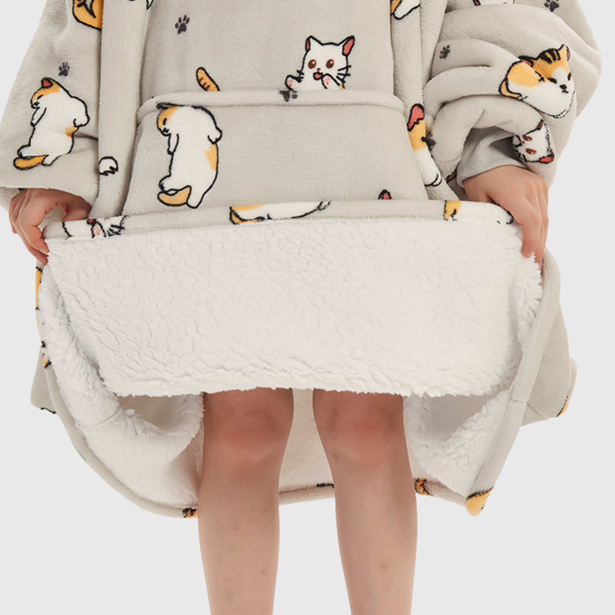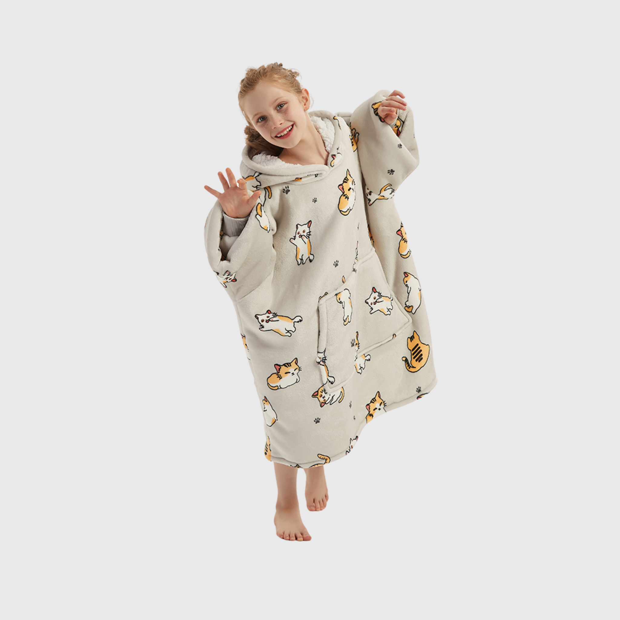 Be happy in this MEOWment. Wrap your little one in the purr-fect coziness of the 'Meowy' Kids' Haven! Featuring an adorable cat print, this wearable blanket is made with ultra-soft fleece on the outside and plush sherpa fleece inside—keeping them warm, snug, and ready for any adventure. 😻