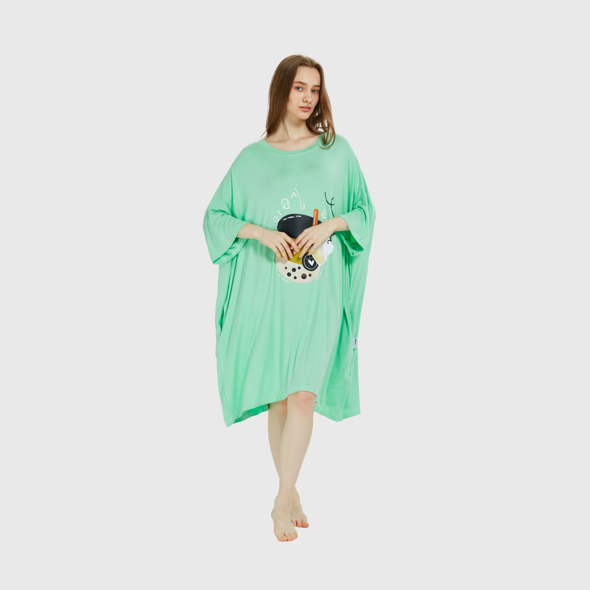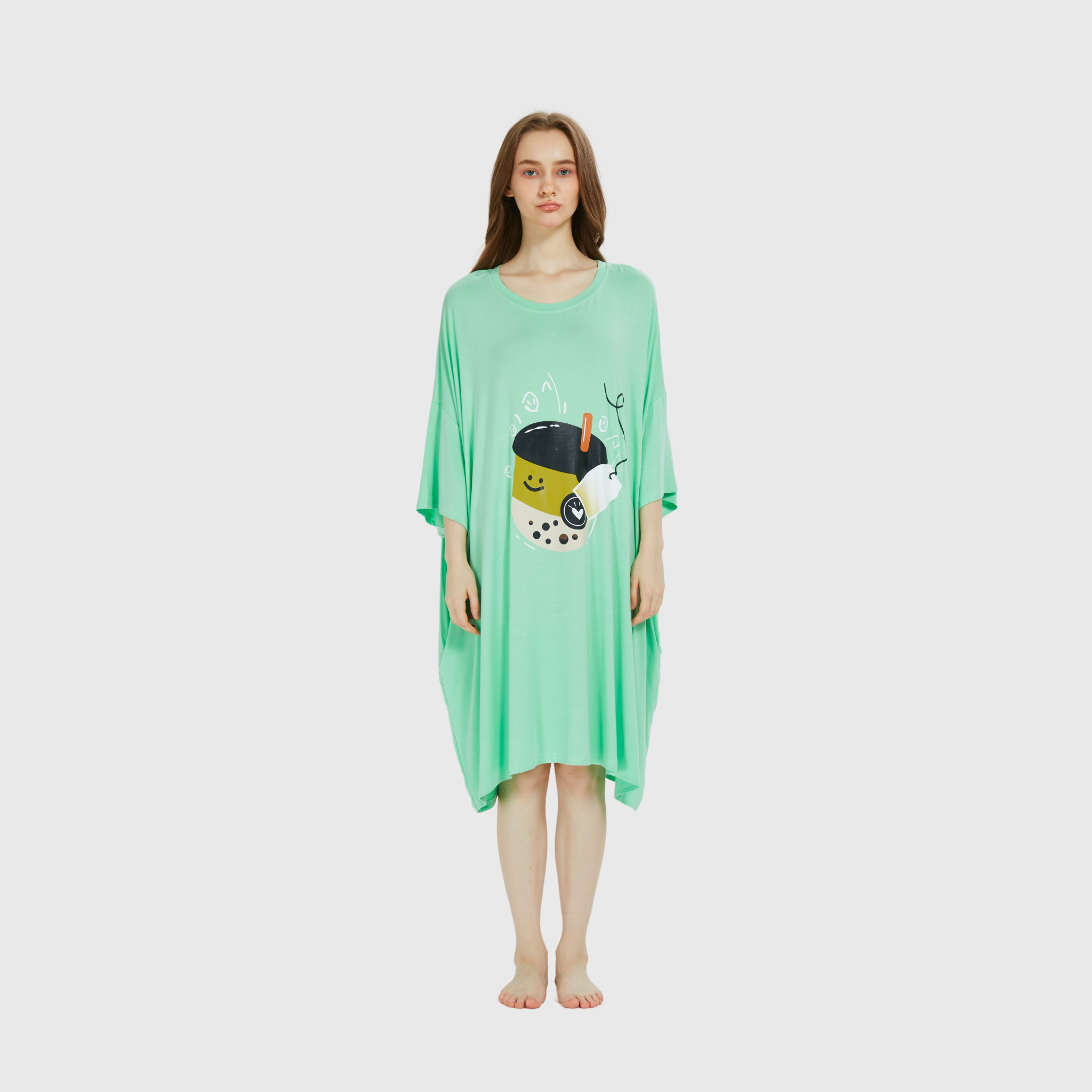 "It’s more than just a tee; it’s a cozy escape with a dash of playful charm." Refresh your loungewear collection with the 'Minty Boba Bliss Sleep Tee,' featuring a whimsical bubble tea design on a soft mint green background. Perfect for relaxing, lounging, or catching up on sleep, this oversized tee redefines comfort and style 🍵